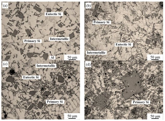 Optical micrographs of (a) Al-12Si alloy (T5); (b) 4 wt.% TiB2/Al-12Si composites (T5); (c) 4 wt.% TiB2/Al-12Si composites (T7); and (d) 9 wt.% TiB2/Al-12Si composites (T5).