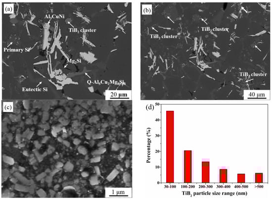 The SEM micrographs of xTiB2/Al-12Si composites (x = 4 and 9 wt.%) in their T5 states are exhibited in Figure 3a,b,e. Figure 3a shows the numerous intermetallic compounds consisting of Cu- and Ni-rich phases (e.g., Al3CuNi), Mg2Si, and Q-Al5Cu2Mg8Si6, which is in good consistency with the results shown in the XRD spectra (Figure 1). Theses phases are beneficial to improve the high temperature strength of Al based materials [30]. Meanwhile, the TiB2 particle cluster has been reported as a common phenomenon during the casting of Al-based composites [1,31]. Figure 3b shows the distribution of TiB2 particle clusters in 4 wt.% TiB2/Al-12Si composite. The TiB2 particle clusters are mainly co-existing with the Si phase at grain boundaries, and the distribution of the TiB2 particulates is relatively uniform throughout the matrix (Figure 3b). Figure 3c shows the typical morphology of TiB2 particles with near-spherical, hexagonal, or quadrilateral shapes [27]. Figure 3d illustrates the size distribution of TiB2 particles in the 4 wt.% TiB2/Al-12Si composite. The size of the TiB2 particles ranges from 30 nm to more than 500 nm. The number of the particles decreases by increasing particle size to 500 nm. Notably, nearly half of the particles are 30–100 nm in size. Figure 3e shows the distribution of TiB2 particle clusters in the 9 wt.% TiB2/Al-12Si composite. The TiB2 particle aggregates significantly as the amount of TiB2 particles increases to 9 wt.%. The TiB2 particle clusters have spread over the matrix with the size up to ~40 μm (Figure 3e).
