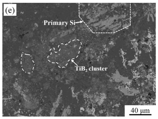 Figure 2a–d show the optical micrographs of the Al-12Si alloy (T5), the 4 wt.% TiB2/Al-12Si composite in both T5 and T7 states, and 9 wt.% TiB2/Al-12Si composite (T5) accordingly. Qualitatively, the size of primary Si at T5 state (Figure 2b) is similar to that at T7 state (Figure 2c) for the 4 wt.% TiB2/Al-12Si composite. Notably, the morphology of eutectic Si changes in these materials at different states. The lamellar eutectic Si, which is actually a network structure in three dimensions, form and are observed in T5 condition (Figure 2b), but disintegrate and become rounder in T7 state (Figure 2c). An aggregation of the primary Si phase with the largest size are in the order of ~100 μm, and a clear spheroidization of the eutectic Si is observed in the 9 wt.% TiB2/Al-12Si composite (Figure 2d).