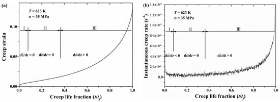 (a) Stage I (a short primary stage): The deformation resistance is low, and the instantaneous creep rate decreases continuously with time (d/dt < 0) due to the work hardening behavior.