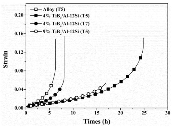 Finally, it is noted that the three stages for both the 4 wt.% TiB2/Al-12Si composite (T5) and the 9 wt.% TiB2/Al-12Si composite (T5) should account for the similar proportion, except in the case under 30 MPa. The result further reveals the similarities in creep curves for the two composites and correspond with the previous observation (Figure 5). However, the difference under the lowest stress is unusual.