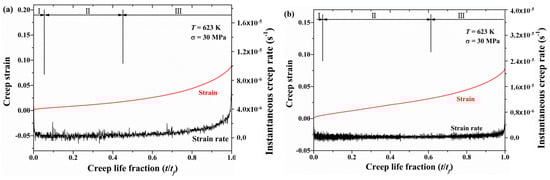 Figure 4a shows the creep curve for the composite using the 4 wt.% TiB2/Al-12Si composite (T5) as an example. In order to compare the creep stages for materials, under different creep life, the creep life fraction is used to substitute the creep time. The three stages can be evidently observed from the creep curve of instantaneous strain rate versus the creep life fraction (Figure 4b).
