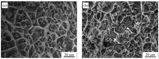 Figure 7 compares the fracture surfaces of 4 wt.% TiB2/Al-12Si composite (T5) and 9 wt.% TiB2/Al-12Si composite (T5). Both fracture surfaces are composed mostly of dimples with the TiB2 particle clusters inside. The dimples result from the formation, growth, and coalescence of voids [14]. Clearly, the dimples are more homogeneous in 4 wt.% TiB2/Al-12Si composite (T5, Figure 7a). On the contrary, the dimples are irregularly distributed in 9 wt.% TiB2/Al-12Si composite (T5). The presence of severe clusters (marked by arrow) has caused the irregular dimples with varying sizes, indicating the detrimental influence to the creep resistance.