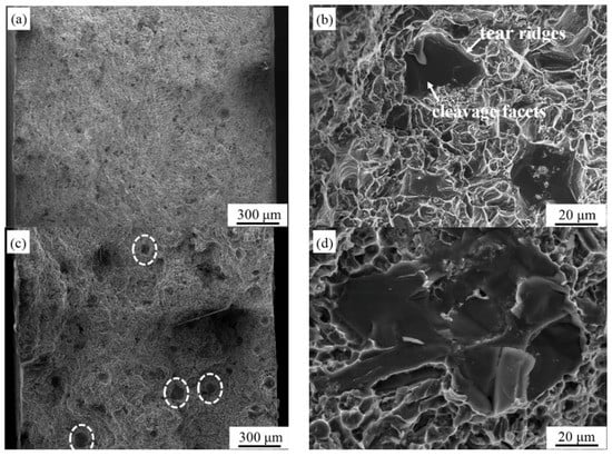 Overview and detailed SEM images of the tensile creep fracture surface of 4 wt.% TiB2/Al-12Si composite (T5) (a) in low magnification; (b) in high magnification and 9 wt.% TiB2/Al-12Si composite (T5) (c) in low magnification; and (d) in high magnification.