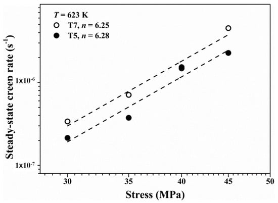 Steady-state creep rate as a function of the applied stress (logarithmic scale) for 4 wt.% TiB2/Al-12Si composite at the T5 and T7 state at 623 K.
