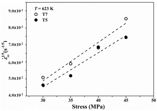 From Figure 10, the linear relationships were observed for both materials when n = 5, which has implied that the governing mechanism for the creep deformation should correspond to the climb of dislocations [5,33].