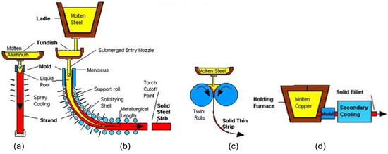Continuous casting: (a) vertical; (b) curved; (c) strip; and (d) horizontal. Reproduced with permission from Brian G. Thomas, 2018 [1].