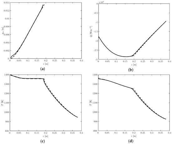 Comparison of: (a) the location of the solidification front, ; (b) the heat flux, Q, at the outer edge of the copper strip; (c) the temperature at the centreline (); and (d) the temperature at the outer edge of the copper strip. In all cases, the solid line is for the full model, and the dashed line is for the reduced model; z denotes the distance along the casting direction from the meniscus. Reproduced from [21], with copyright permission from Elsevier, 2017.