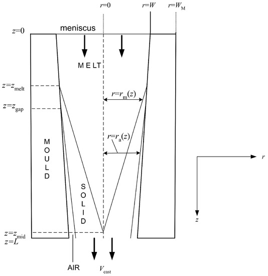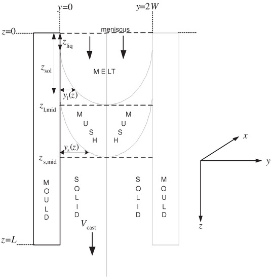 There are several motivations for this hybrid asymptotic/numerical approach. The first is that it has been applied successfully in other areas of science and technology, as witnessed by the growth of an activity known as practical asymptotics [3,4,5,6,7,8]; note, however, that this is not identical to the model order-reduction approach [9], which is also prevalent in industrial mathematics. The second is the Moore’s law effect in modelling [10]: namely, that, although computational power doubles every 18 months, it will still be many years before all the length scales in a casting process will be numerically resolved [11]. Moreover, although the use of asymptotic methods for the modelling of continuous casting is not unknown, it remains somewhat limited to fluid flow and heat transfer aspects [12,13,14,15,16,17,18,19,20]. Thus, the goal here is to review recent activity in this area, based primarily on the activities of the author and co-workers [21,22,23,24,25,26,27,28,29,30,31,32,33].