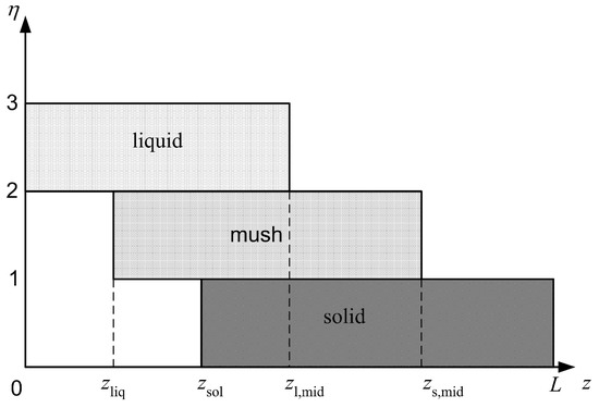 In general of course, the alloys that are cast have a substantial solidification interval, leading to the formation of a mushy zone between the melt and the solid, in which both coexist; thus, the situation is now more akin to Figure 4 than Figure 2. Typically, the numerical solution of the governing equations is handled by introducing an auxiliary variable, commonly the local liquid fraction, and using an enthalpy formulation on a fixed grid [37,38,39,40,41]. This generally functions well enough if a basic description of fluid flow and heat transfer is required—all the more so if the solidification interval of the alloy is large. However, it is often required to determine quantities that affect the quality of the final solidified alloy, such as the degree of macrosegregation of an alloy’s solute elements, the ratio of equiaxed-to-columnar crystals or the thermomechanical stress; all of these are associated with processes in the mush. Thus, to compute all of these quantities accurately in the region where they really matter, it would be convenient to be able to resolve the locations of the solid-mush and mush-liquid interfaces explicitly.