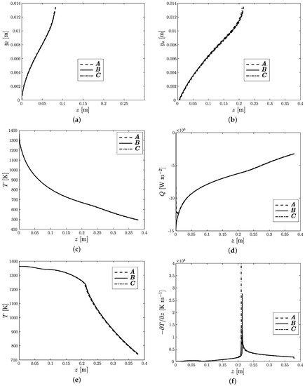 The key results are summarized in Figure 6. Figure 6a–f shows, respectively, the location of the liquidus isotherm (), the location of the solidus isotherm (), the mould wall temperature, the heat flux at the mould wall, the centreline temperature and the temperature gradient in the casting direction at the centreline, and indicates that the novel formulation gives results that agree very well with those of the more conventional formulations and . In future, it is therefore hoped to extend this formulation for modelling the multiphysical phenomena that are present in the mushy zone, as mentioned above.