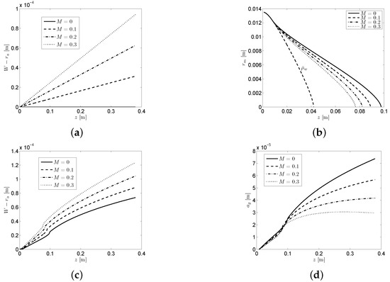In [28,29], the interplay of melt superheat and mould taper was considered for an axisymmetric continuous casting geometry, although we just focus on the effect of mould taper itself for one particular value of superheat here. Figure 8a shows the different taper profiles considered; here, M is a dimensionless parameter related to the actual mould taper, in per cent/m, by