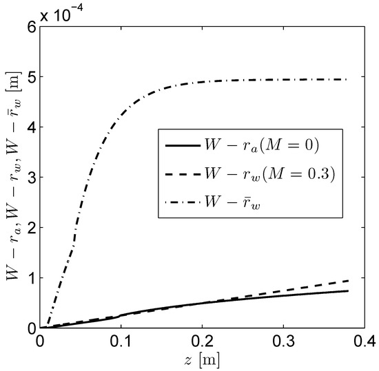 where is the thermal expansion coefficient of the metal and is an appropriate temperature scale for the problem (see [28,29] for exact details). Figure 8b–d shows, respectively, how the position of the solid/air interface (), the position of the solid/air interface () and the width of the air gap, : vary with z for different values of M. Lastly, Figure 9 gives an idealized result: the minimum taper necessary to avoid any air gap at all, with Figure 8b also showing the profile for denoted there by that this would correspond to. However, in Figure 9, a taper profile that is much more extreme than those currently in use would be required.