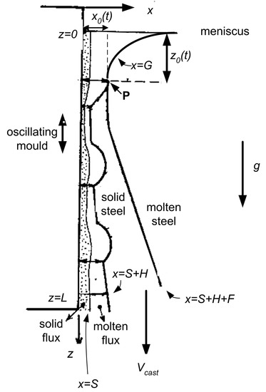 In further work [32], an attempt was made to extend the model to include the effect of the meniscus, thereby allowing the possibility of model parameters to drive whether the model predicts fold-type or overflow-type marks. For this purpose, a novel “ moving-point” formulation was derived, which unlike the volume-of-fluid (VOF) formulation adopted in [56,58,59,60,61], attempts to track explicitly the location of the point at which solidification first begins. This approach suggests that if solidification has not occurred within a capillary length from the top of the meniscus, then the meniscus profile predicted by Bikerman [62], and which emerges naturally in the asymptotic analysis in [32], will collapse, leading to overflow; however, further work is required to extend the isothermal model derived in [32] to determine where the temperature first becomes low enough for the steel to start to solidify.