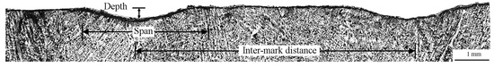 Although the continuous casting configurations shown in Figure 2, Figure 4 and Figure 7 indicate a mould that is stationary, in reality, it is made to oscillate in the casting direction; this is particularly so for the continuous casting of steel. Moreover, a mould powder, often termed flux, is introduced over the steel melt; the powder becomes molten and the flows between the steel and the oscillating mould, with the resulting configuration being as in Figure 10, which depicts the initial stages of solidification in continuous casting. In this way, solidified steel is prevented from contacting the mould directly and resolidified flux is shaken from the surface of the mould. However, as is well-known and hinted at in Figure 10, a detrimental effect of this construct is the formation of depressions on the surface of the solidified steel, commonly referred to as oscillation marks; an experimental example is shown in Figure 11. Moreover, although the mould oscillation is normally periodic in time, this does not in general mean that the marks which form are identical and periodically spaced. For example, Figure 12 shows the spacing between thirteen marks, also termed as the pitch, taken from a continuously cast steel sample, from which it is clear that, more often than not, the pitch obtained was close to the average value. This may in itself not be noteworthy, other than that this average value is also close to the theoretical value, as we show below. Further samples of experimental oscillation-mark data, arguably the largest ever collected from a single continuous casting process, can be found in [53,54].