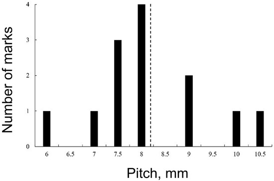 Experimental results showing the number of marks associated with a given pitch, taken from [30]. The vertical dashed line shows the average value.