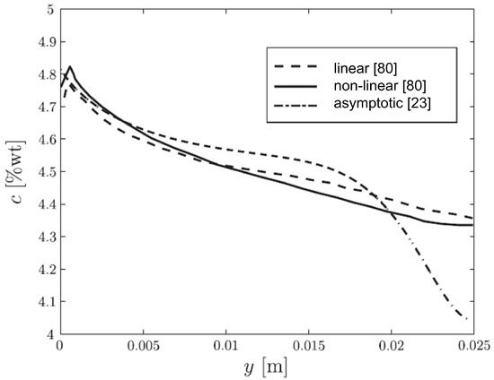 The results of the approach were compared with those obtained in [80] using CFD for the continuous casting of an Al-4.5 wt% Cu alloy, and are shown in Figure 14. Several features are noteworthy in this figure. First, we see so-called inverse segregation at : this is the well-established phenomenon wherein the solute concentration is higher at the outer surface of the casting than it is elsewhere [65,74,81]. Moreover, near we would expect to see negative segregation, i.e., the concentration would be less than the initial composition. Note that two curves have been included from [80]: one using the linearized phase diagram for the Al-Cu system, and one using the non-linearized phase diagram. As can be seen, the agreement with the results of the asymptotic model is very reasonable for m, although rather less so thereafter. This could be due to a variety of factors:
