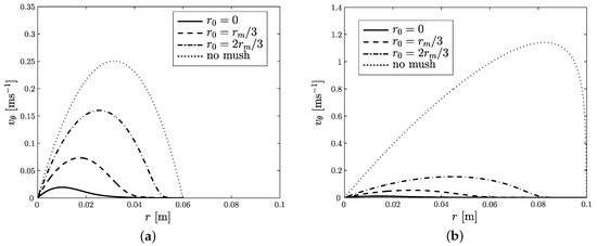 Azimuthal velocity, , vs. radial distance, r, for and no mush, with: (a) m; and (b) m.