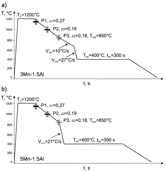 Parameters of thermomechanical processing of (a) 3Mn-1.5Al steel and (b) 5Mn-1.5Al steel (TKW—finish rolling temperature).
