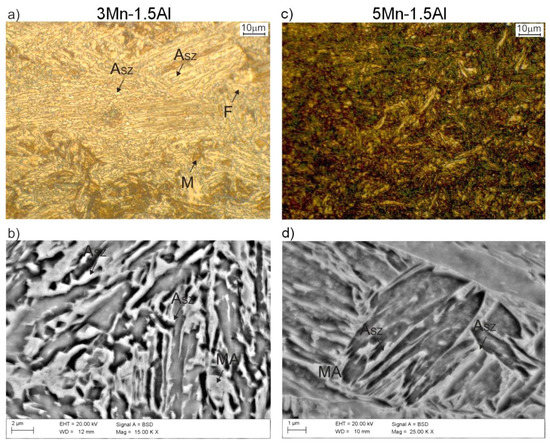 Bainitic microstructures with retained austenite and martensitic-austenitic constituents (a,b) 3Mn-1.5Al steel, (c,d) 5Mn-1.5Al steel; F—ferrite, M—martensite, MA—martensite-austenite constituents, ASZ—retained austenite.