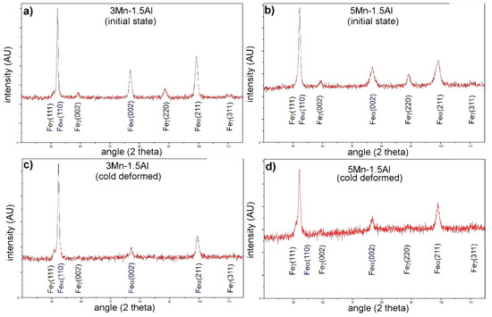 X-ray diffraction patterns of: (a) 3Mn-1.5Al steel, (b) 5Mn-1.5Al steel at the initial state, (c) 3Mn-1.5Al steel, (d) 5Mn-1.5Al steel after static tensile tests (cold deformed).