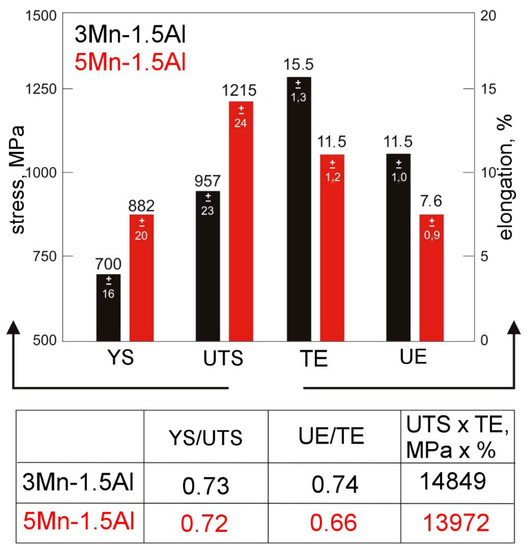 Mechanical properties determined in a static tensile test are presented in Figure 6. Tensile tests showed that the increase in manganese content from 3.3% to 4.7% leads to different mechanical properties. One can observe a significant difference in strength (UTS, YS) and plastic properties (TE and UE). With increasing Mn content, yield strength increases from 700 to 882 MPa while the difference in tensile strength was around 260 MPa. A calculated YS/UTS ratio ca. 0.73 confirmed that both investigated steels show high work strengthening after yielding.