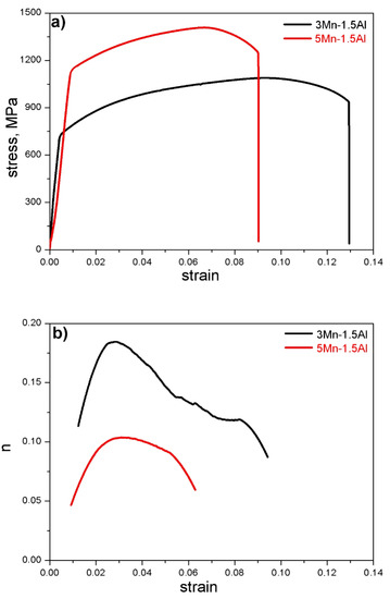 A UTS value depends on the ability of steel to strain hardening. The values of uniform elongation, which are 11.5% and 7.6%, respectively for 3Mn-1.5Al and 5Mn-1.5Al steels (Figure 6) depend also on the strain hardening rate. Kaar et al. [28] reported that too high aluminum and manganese contents deteriorate the plasticity of the TRIP steels at increased strengths. Considering the UE/TE ratios which are 0.74 and 0.66 for the steels of lower and higher Mn contents respectively, it can be concluded that 3Mn-1.5Al steel is more susceptible to uniform straining. Total elongation values were relatively good (15.5% and 11.5%). The curves showing true stress vs. true strain and work hardening exponent vs. true strain are presented in Figure 7a,b. Based on the obtained results (Figure 7b), it can be concluded that the steel with lower Mn content shows a better tendency to more gradual strain hardening. The shape of the curves indicate that the highest work hardening rate is limited to the initial stage of strain, i.e., in the range of true strain of up to ~0.04. The value of the work hardening exponent increases rapidly to ~0.18 and 0.1—for 3Mn-1.5Al and 5Mn-1.5Al steels, respectively. Its increase is probably related to the occurrence of the strain-induced martensitic transformation. After reaching the maximum, the n exponent value deteriorates rapidly for both investigated steels. It results in a smaller contribution of martensitic transformation to further strengthening of the steel. In case of the steel with a lower manganese content, a slight delay in the decrease of work hardening exponent value in the true strain range 0.06–0.09 was observed. It may be due to more intense martensite formation, which delays necking in the 3Mn-1.5Al steel.