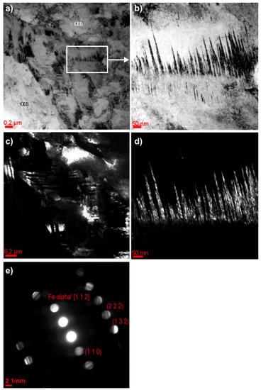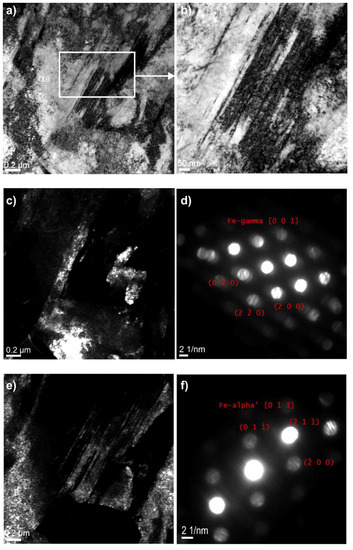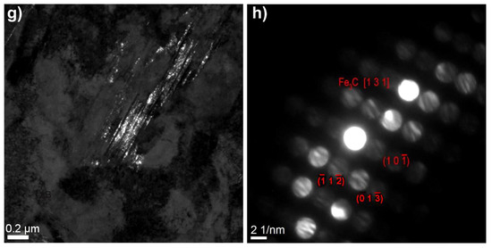 Figure 10b shows the magnified martensitic area, which was confirmed by the microdiffraction in Figure 10e. Martensite observed in the steel containing 5% Mn had also a thin-plate morphology (Figure 11). The identification of these structural constituents was done using electron diffraction, and this was illustrated using the dark field technique (Figure 11c–f). The diffraction patterns in Figure 10 and Figure 11 show a disk-type diffraction, which is a characteristic of the convergent beam electron diffraction (CBED). Due to the lower carbon enrichment of the γ phase compared to the 3Mn-1.5Al steel and the disadvantageous effect of the increasing concentration of Mn on the lowering the Fe3C precipitation temperature [20], fine carbide precipitates were also identified between the martensite plates (Figure 11g,h).