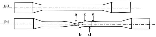 (a) Tensile sample of experiment steels; (b) five slices at every 2 mm thickness, numbered through a to e, were obtained.