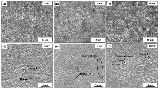 Optical micrographs (OM) and scanning electron microscope (SEM) images at different austenitising temperatures. (a) and (d) 850 °C; (b) and (e) 950 °C; (c) and (f) 1050 °C.