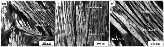 Transmission electron microscope (TEM) images treated at different austenitising temperatures. (a) 850 °C; (b) 950 °C; (c) 1050 °C.