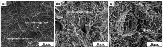 Figure 4 displays the tensile fractography of the tensile specimens at different austenitising temperatures. The fracture surface at 850 °C (Figure 4a) consists of large quasi-cleavage facets and an intergranular fracture, indicating a brittle fracture mode. The fracture surface with different size dimples at 950 °C is shown in Figure 4b, which indicates a better toughness in comparison to that illustrated in Figure 4a. Austenitising at 1050 °C (Figure 4c) resulted in an extremely high density of dimples, indicating a typical ductile mode of fracture. It can be deduced that a higher austenitising temperature produces a positive effect on improving elongation.