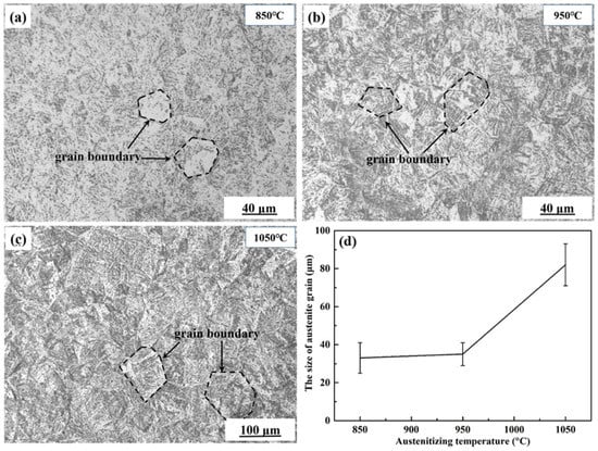 Optical micrographs (OM) of the austenite grain boundaries are presented in Figure 5a–c. Obviously, the fine austenite grain can be obtained when austenitising temperature at 850 °C and 950 °C. The austenite grain size was measured using the linear intercept method. The austenite grain is coarsened due to an increase in the austenitising temperature. The average austenite grain size, compared with that at 850 °C (33 ± 8 μm) and 950 °C (35 ± 6 μm), was significantly larger at 1050 °C (82 ± 11 μm), while only a little difference was seen between 850 °C and 950 °C (Figure 5d).