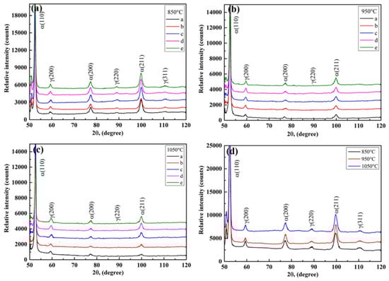 X-ray diffraction (XRD) patterns of retained austenite content at five necking sites at (a) 850 °C; (b) 950 °C; (c) 1050 °C, respectively. (d) The retained austenite content of matrix.