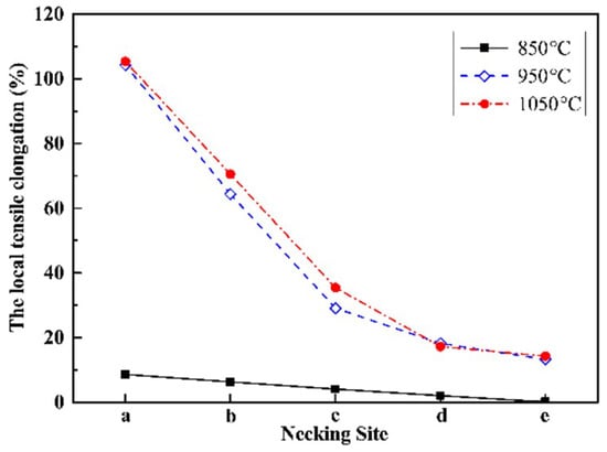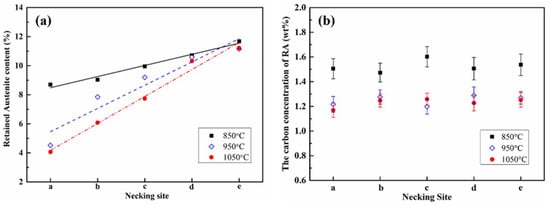 Representative XRD patterns (Figure 6a–c) confirmed the volume percentage of retained austenite dependence of necking sites. All test specimens were consisted of bainitic ferrite, martensite, and retained austenite. With the necking sites from a–e, the volume fractions of the retained austenite were increased with approaching to site e (Figure 7a). It is evident from site e that the volume percentage of the retained austenite of 850 °C (11.68%) is slightly higher than that of 950 (11.15%) and 1050 °C (11.22%). However, from the investigation of site a, the retained austenite content at 850 °C (8.70%) was significantly higher compared with that at 950 (4.52%) and 1050 °C (4.06%), indicating that only a small part of the retained austenite was transformed into martensite during the tensile process for 850 °C. The three straight lines represent the trend of the content of retained austenite with necking sites at different austenitising temperatures after linear fitting. The carbon concentration of retained austenite at different necking sites are shown in Figure 7b. The experimental results show that the carbon concentration in the retained austenite of different necking sites is similar to that of the matrix. This means that the tensile process has essentially no obvious impact on the carbon concentration in the retained austenite.