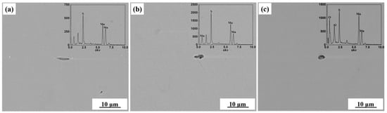 MnS inclusions at different austenitizing temperatures of (a) 850 °C, (b) 950 °C, and (c) 1050 °C. The inset in the upper right represents the composition of MnS.