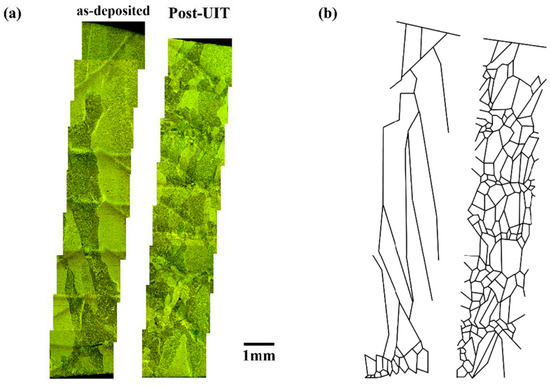 - The macrostructure of prior-β grain changed from coarsen columnar β grain to an alternating distribution of equiaxed grain and short columnar grain, and formed a bamboo-like structure. The average grain size decreased from 785 μm to 371 μm, and the respect ratio of the β grain of the as-deposited samples and post-UIT samples are 3.42 and 2.16, respectively. The equiaxed grain size and respect ratio of the post-UIT samples are 186 μm and 1.33 μm.