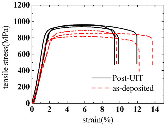 - UIT improved the mechanical properties of the samples fabricated by WAAM. The tensile strength of the post-UIT samples (934 MPa) was higher than that of the as-deposited samples (870 MPa). However, the ductility of the post-UIT samples (10.29%) was not as high as the as-deposited samples (11.95%).