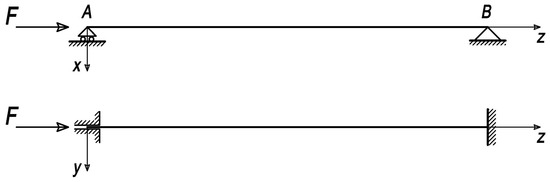 Let u, v and w denote the displacements of the cross-section centroid in the x, y and z directions; and the angle of twist. In a first modeling of the boundary conditions of the beam, the end rotations around the z axis (torsional or twisting rotations), the end rotations about the x axis (out-of-plane flexural rotations), and the cross-section warping are prevented (), while flexural rotations around the y axis (in-plane flexural rotations) are not constrained. Such a modeling assumes the presence of a movable cylindrical hinge at section A, which allows translations along the beam’s axis z, and a fixed cylindrical hinge at section B, which prevents the translations along the x, y and z axes (cylindrical hinge boundary conditions, cf. Figure 2). A second modeling instead assumes zero (both in-plane and out-of-plane) flexural rotations and zero torsional rotations at both ends of the beam (clamped boundary conditions).