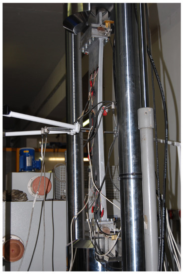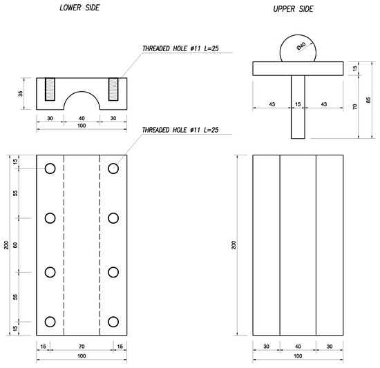 The tested sample was mounted on a universal testing machine (Italsigma s.r.l., Forlì, Italy), equipped with 550 kN load cell, employing displacement control with loading rate of 5 Hz. The sample was beveled and produced press-bending a sheet metal in steel-grade (Table 2). As shown in Figure 3 and Figure 4, each cylindrical hinge is made up of two parts: the upper one, which represents the portion to be gripped, is made up of two cm long and mm thick steel blades, welded orthogonally to each other at the center line; the vertical blade is clamped directly to the operating machine. Below the horizontal slab is welded a cm long steel cylinder (male) with a mm radius. This represents the real hinge constraint.