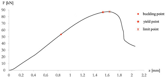 Figure 6, Figure 7, Figure 8 and Figure 9 illustrate the results of the experimental test of the beam model illustrated in Section 2 and the buckled configuration of the beam. The experimental F vs. w curve (Figure 6) shows a stable pre-buckling path: the load and deformations simultaneously rise until a limit point (red cross mark “×” in Figure 6) is reached. Beyond the limit point, the tangent modulus rapidly decreases as the deformation increases with an unstable, descending, post-buckling path. The beam exhibits antisymmetric behavior, with sensitivity to geometric imperfection and load eccentricity, which is customary in coupled stability problems. The bifurcation point degenerates into a limit point with an Erosion of the Critical Bifurcation Load (ECBL) due both to the imperfections and to the effect of interaction between the purely bending mode and the bending-twisting mode ([30]). We identify the experimental buckling load with the first inflection point of the experimental F vs. w curve at kN (red circle mark ‘•’ in Figure 6). The beam buckles when it is still in the elastic range so that the beam failure is governed by geometric, rather than material, non-linearity. The tested beam reaches the yield strength kN (red star mark ‘⋆’ in Figure 6) when the vertical displacement reaches the value of mm. Such a yielding point was detected from the strain gauge readings. The experimental results highlighted a second, distortional buckling event (local-torsional mode), taking place after the occurrence of the flexural-torsional buckling mode, for kN. Such a second buckling phenomenon caused the flange to start rotating about the flange/web junction (cf. Figure 8).