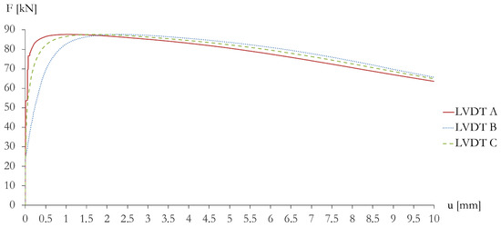 The analyzed beam sample was equipped with displacement transducers of the WA-type series and uniaxial electrical resistance strain gauges ( mm long) for general stress measurement along the and directions on both sides of the beams, as shown in Figure 5. Lateral and distortional deflections of the steel beam was measured by means of four Linear Variable Differential Transducers (LVDTs) along the beam length. As depicted in Figure 5, three of them (labeled LVDT A–C) were mounted, horizontally, to the front and rear web at mid-span of the beam, to capture its lateral deflection. The last transverse LVDT (LVDT L) was placed, horizontally, on the top flange, to capture distortional buckling mode in addition to the flexural-torsional mode.