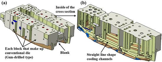 A conventional die that is generally used in the HPF process consists of an upper die (Gun-drilled type) and a lower die (Pocket type). Figure 1a shows the upper part of the conventional die and several blocks constitute one upper die. The cooling channel inside the upper die is machined with a straight drill and all cooling channels are linear shaped, as shown in Figure 1b. This linear shape makes it easy to process and repair the cooling channels. In addition, the interior of the gun-drilled type die has excellent structural strength because there is no empty space other than the cooling channels. The linear shape of the cooling channels, however, makes it hard to be machined along the surface of the curved die and the distances between the upper die surface and the cooling channels are not constant. For this reason, the heat transfer from a blank to the upper die during the HPF process can be uneven, resulting in a temperature variation in the blank. This temperature variation deteriorates the quality of the blank.