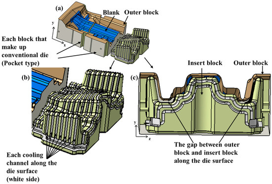 Conventional lower die (Pocket type): (a) Shape; (b) Cooling channel structure; (c) Insert and outer block.