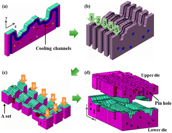 A slice die was proposed to overcome the disadvantages of the conventional dies, such as low cooling performance and weak structural strength. As shown in Figure 3a, the slice die consists of several divided pieces, while the conventional die consists of several blocks to make a single die. After machining half of the cooling channels on both sides (yz side) of each die piece, several die pieces are assembled and constitute a set, as shown in Figure 3b. Then, several sets are combined (Figure 3c) and comprise a die (Figure 3d). Particularly, the slice die is designed as a free-form surface with a blank shape along both the upper and lower die surface and the cooling channel is machined along the die surface to a shallow and uniform depth in the -y direction, as shown in Figure 3c.