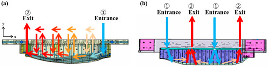 Furthermore, the slice die can control the cooling water flow. Figure 4a,b shows the cooling water flow on the upper part of the conventional die and the slice die, respectively. As shown in Figure 4a, the conventional die has only one entrance and exit and the cooling water flowing into the entrance flows along the arrows repeatedly up and down, left and right, and then flows to the exit. This cooling water flow method maximizes and evenly distributes the heat transfer between the blank and the die, however the cooling channels of the gundrill type die become long and complicated. On the contrary, as shown in Figure 4b, the slice die has two entrances and exits. The cooling water flows into two entrances at the same time and flows to the two exits through a short travel route compared to the conventional die. This method decreases the circulation period of the cooling water and increases the cooling efficiency. Furthermore, the lower die of the slice die has improved structural strength and durability compared to the pocket die as the structure shape of the lower die does not need a gap. Moreover, raw material loss and repair cost are reduced leading to cost saving compared to pocket dies.