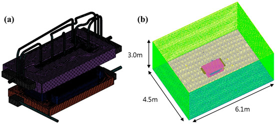 Meshed model of the numerical analysis (a) Solid part mesh; (b) Exterior volume mesh.