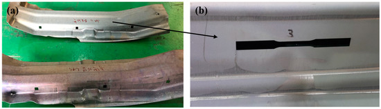 (a) Blank manufactured by the HPF (Hot Press Forming) process; (b) Tensile test specimen from the blank.