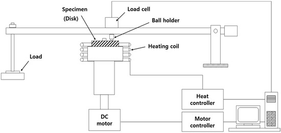 In addition, the wear resistance and durability of the die was confirmed by wear tests. Figure 7 is a schematic view of a high temperature wear tester. This device is a ball-on-disk type and a load of 5 N was applied to a 9.2 mm diameter ball made of SKD11 material. Then, a SKD61 material with a circular disk shape was placed under the loaded ball and was rotated to obtain friction coefficient data. The motor rotated the disk and the controller controlled the rpm of the motor. For high temperature wear tests, an induction heater heated the disk and the temperature of the disk was higher than that of the die during the HPF process.