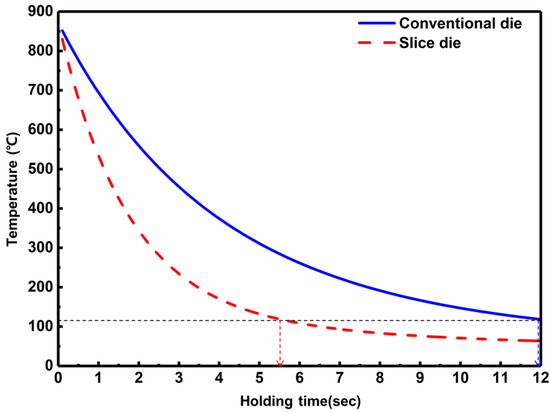 Figure 8 shows the maximum temperature of the blank regarding holding time in HPF simulation for conventional and slice dies. The initial blank temperature at the simulation is set as 870 °C which is the actual blank temperature at the HPF process when the blank is transferred to the die after being heated in a furnace. To be consistent with the actual HPF process, the simulation is also carried out for a holding time of 12 s.